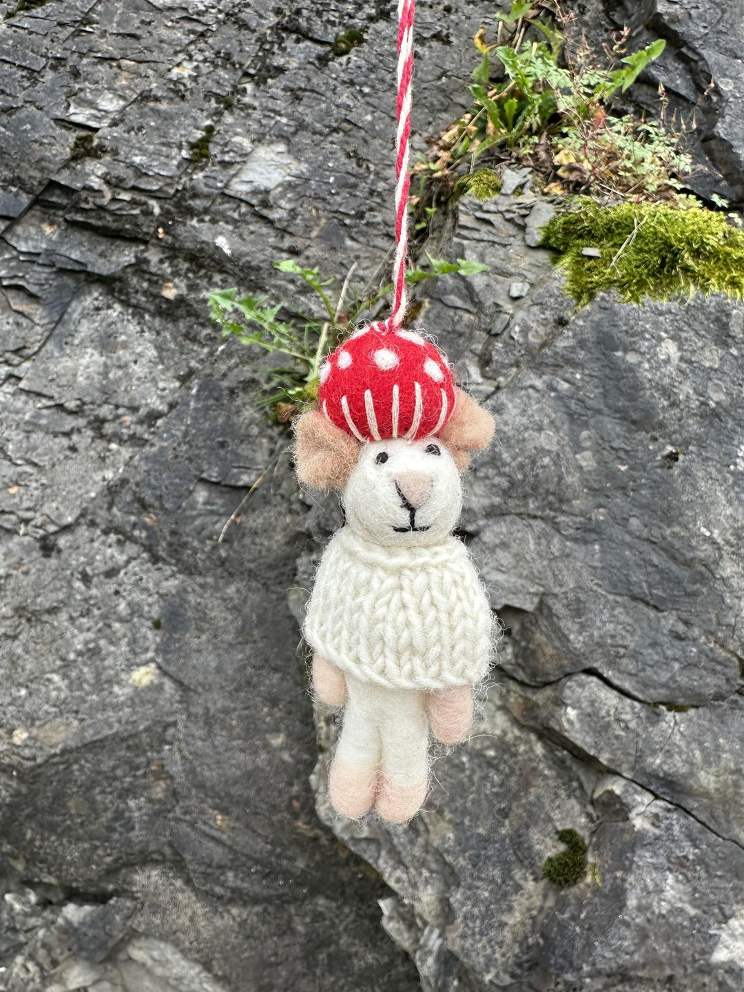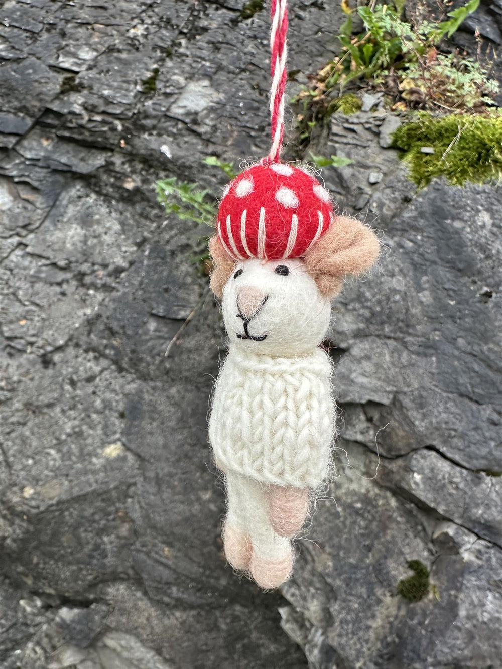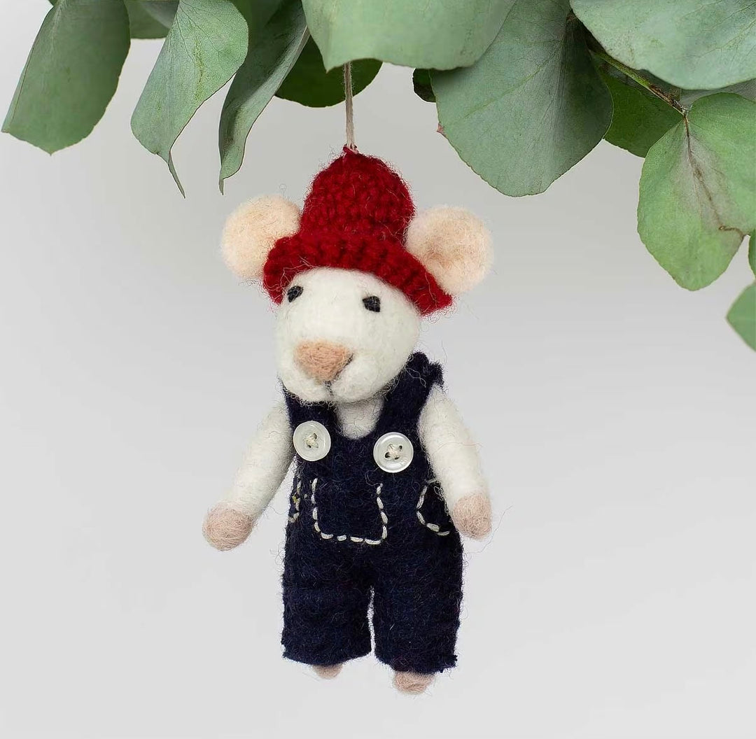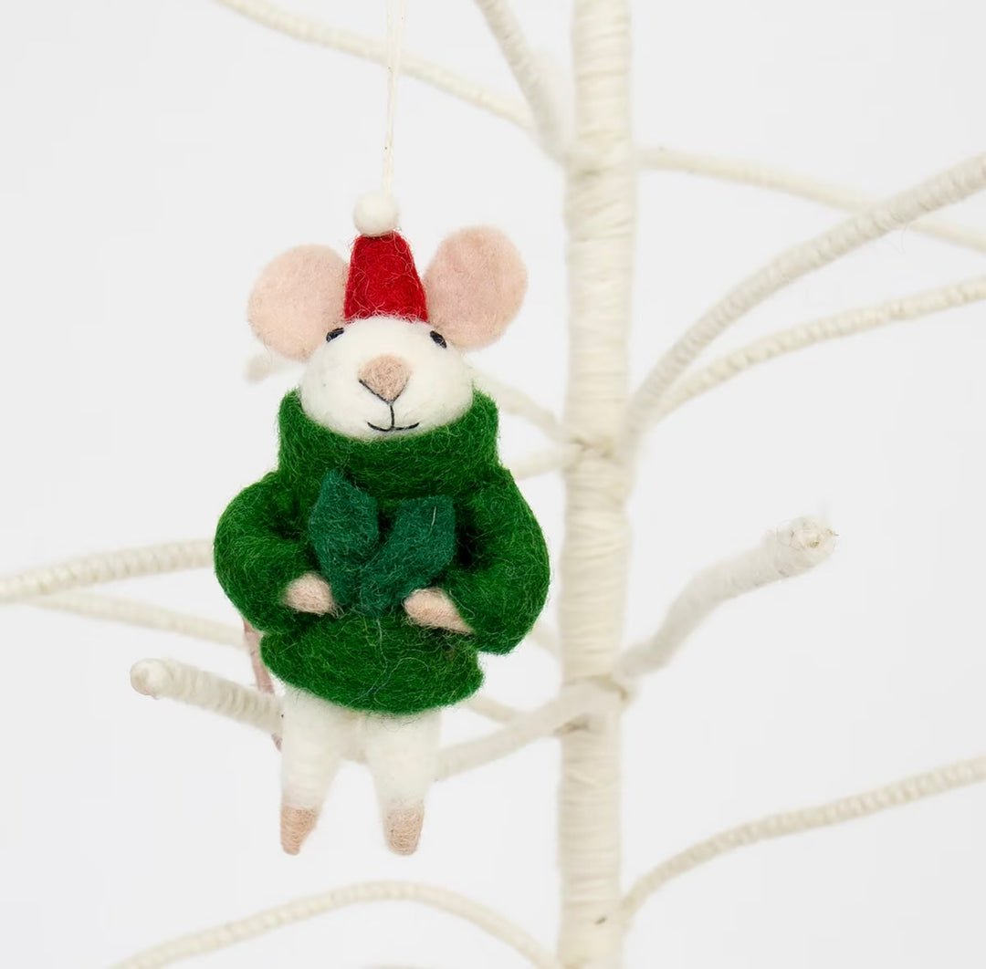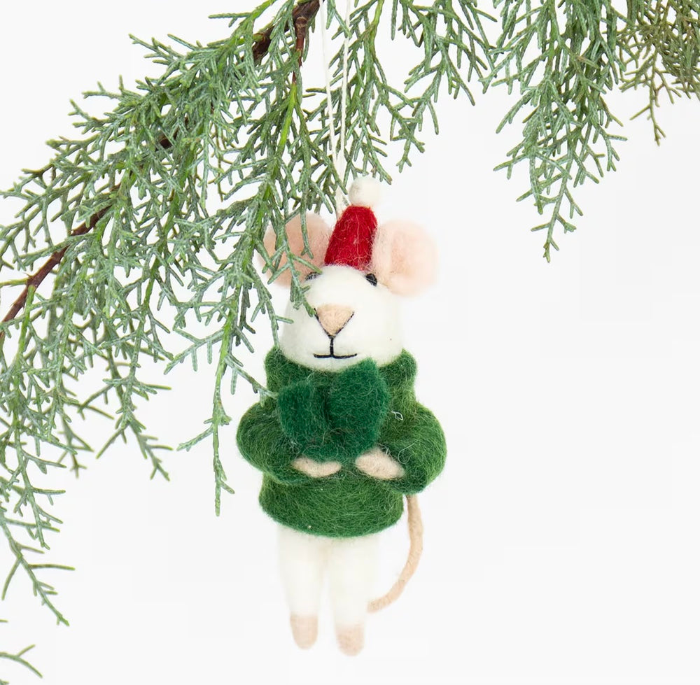 Juletrepynt musejulenisse med grønn genser og rød lue