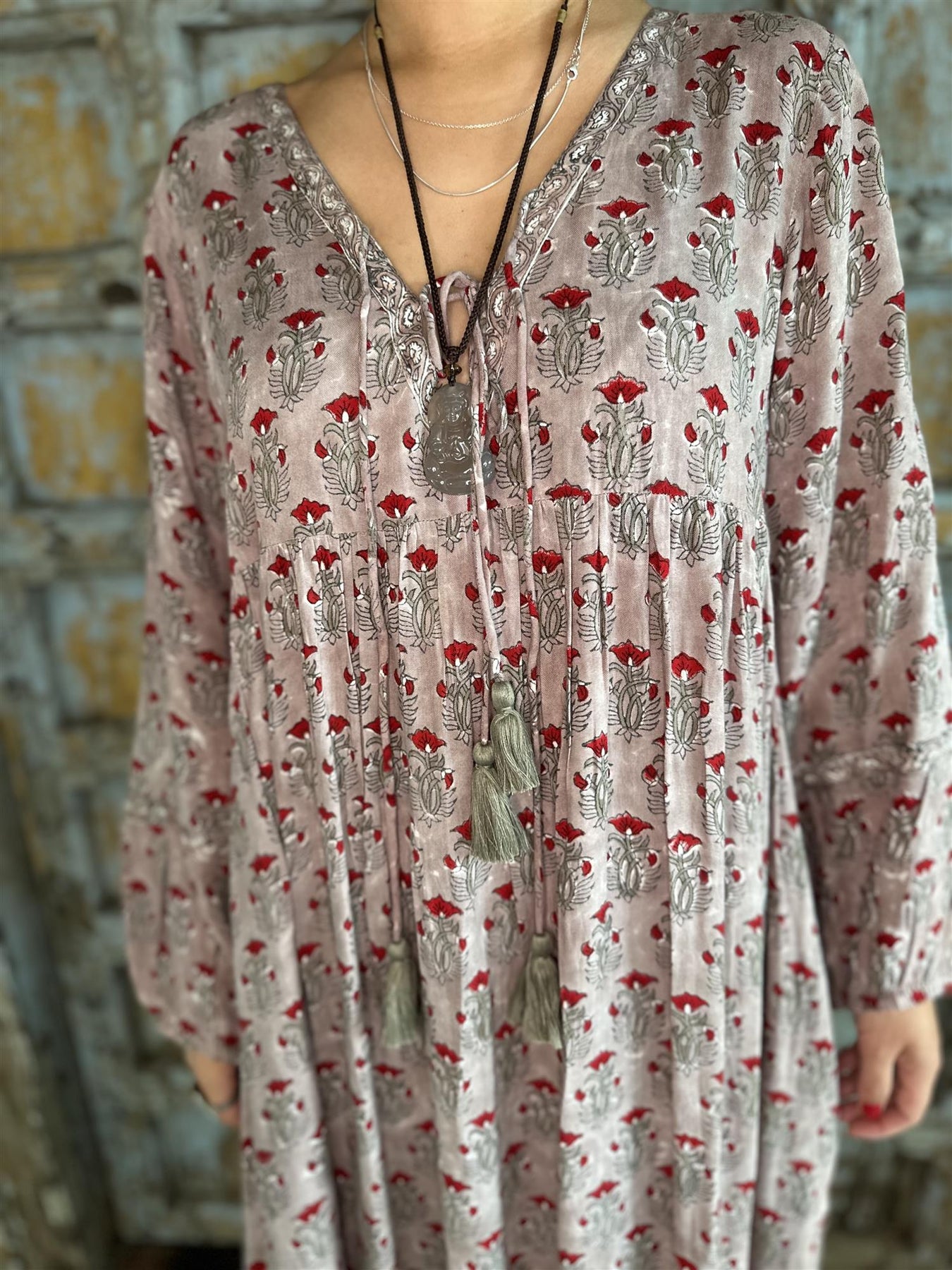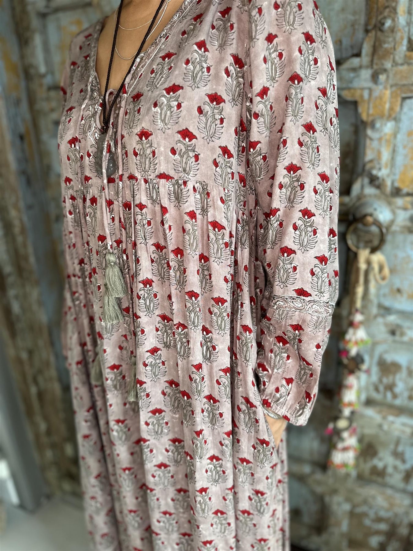 Vår bestselger i høstfarger. Border rundt halsen og på stolpen foran, på ermet og nederst på kjolen. På bordene i halsen og på ermet er det små paljetter som kjør kjolen litt mere selskapelig. 2 snøringer i halsen med dusk nederst. Lang erm med strikk nederst.