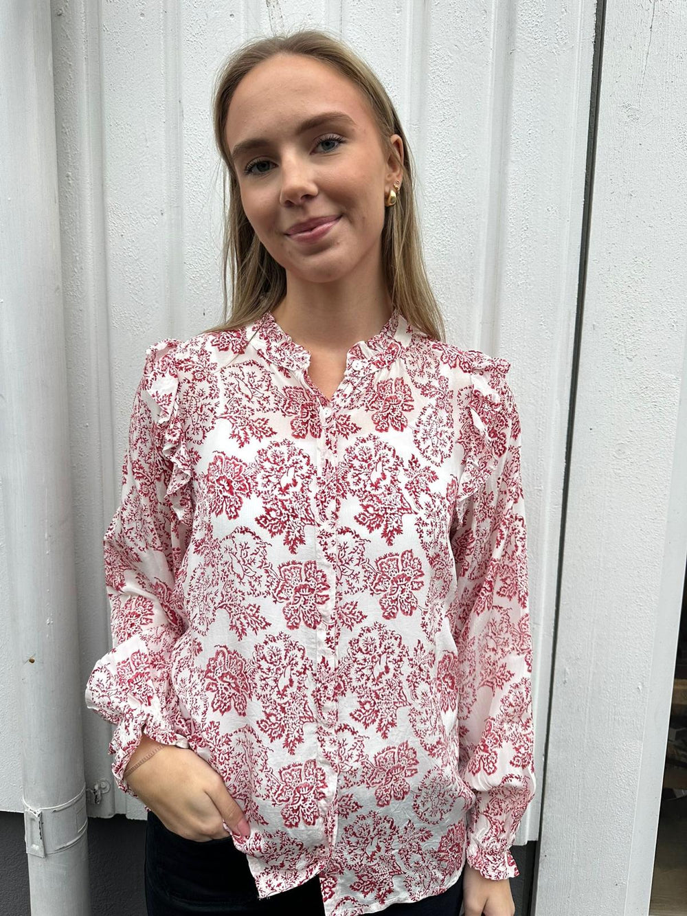 Nydelig feminin bluse med smalere passform. Fin detalj med rysjer på kragen, på skulderen og nederst på ermet. Skjult knepping hele veien ned foran.