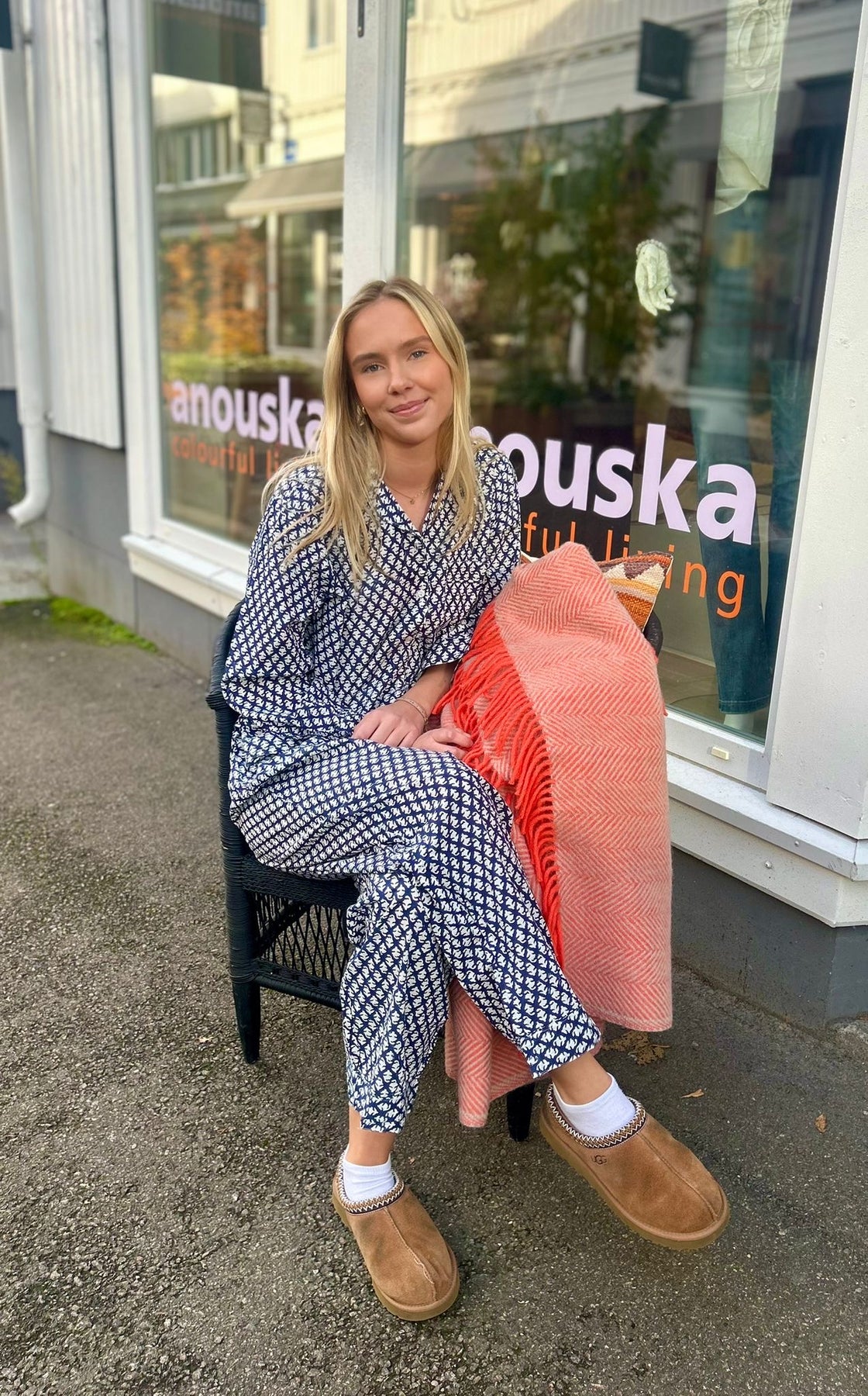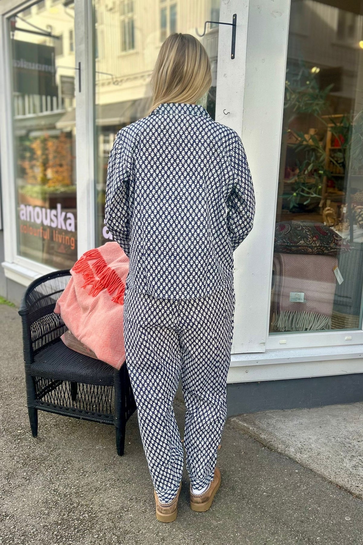 Pyjamas jakke og bukse med blokktrykket mønster i myk økologisk bomull. Jakken har lomme på brystet og buksen har strikk samt snøring i livet.