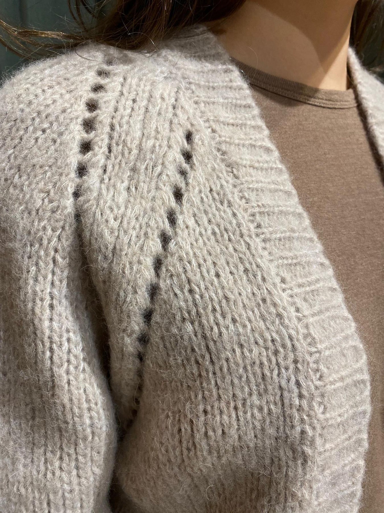 Lekker kittfarget cardigan fra Sibin Linnebjerg i 50% baby alpaca, 30% polyamide og 20% superfine ull.