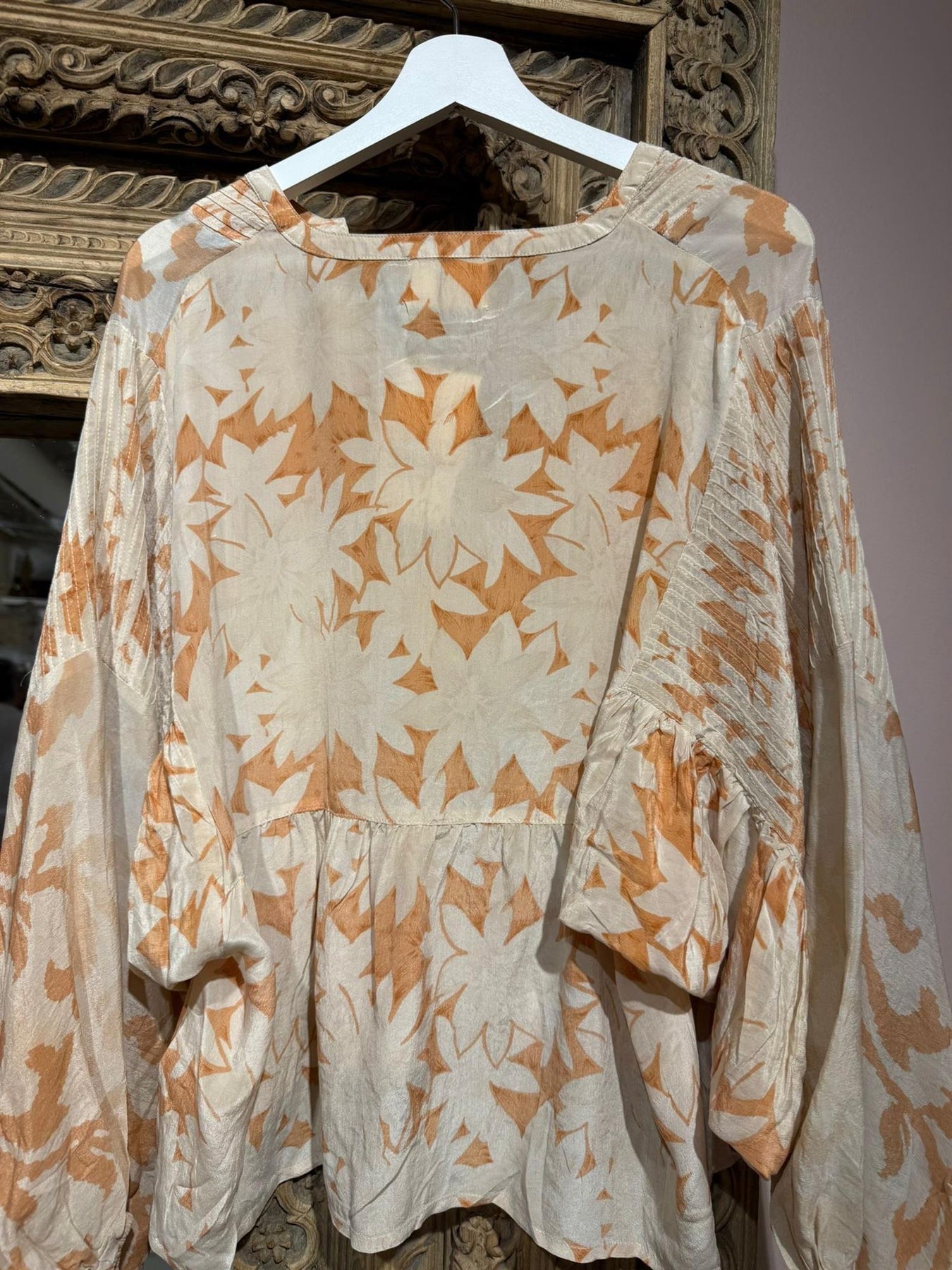 Bibi balloon blusene fra Sissel Edelbo er laget av vintage saristoffer. Ingen er like. La den henge løst eller dytt den litt oppi buksen eller skjørtet på den ene siden.