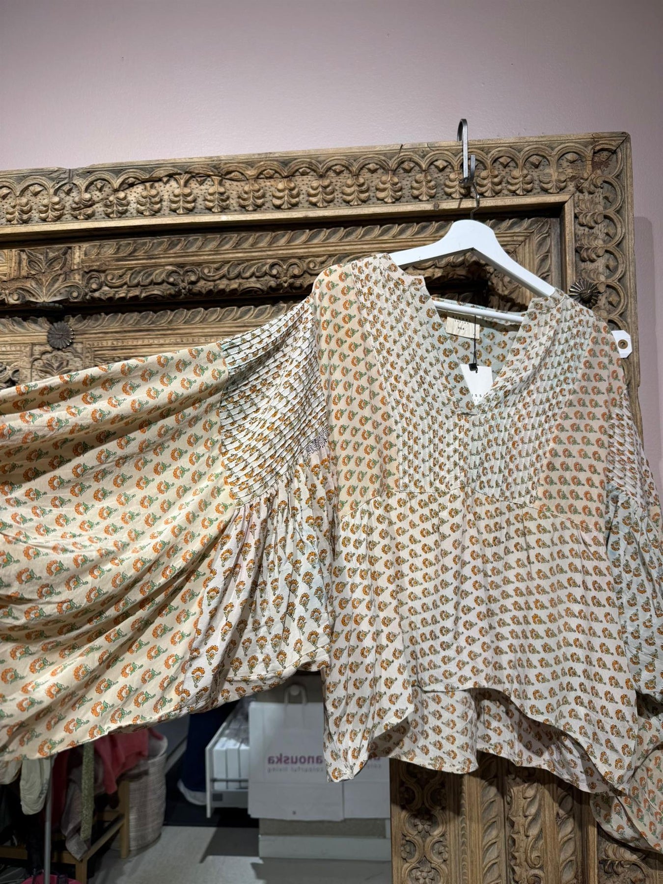 Bibi balloon blusene fra Sissel Edelbo er laget av vintage saristoffer. Ingen er like. La den henge løst eller dytt den litt oppi buksen eller skjørtet på den ene siden.