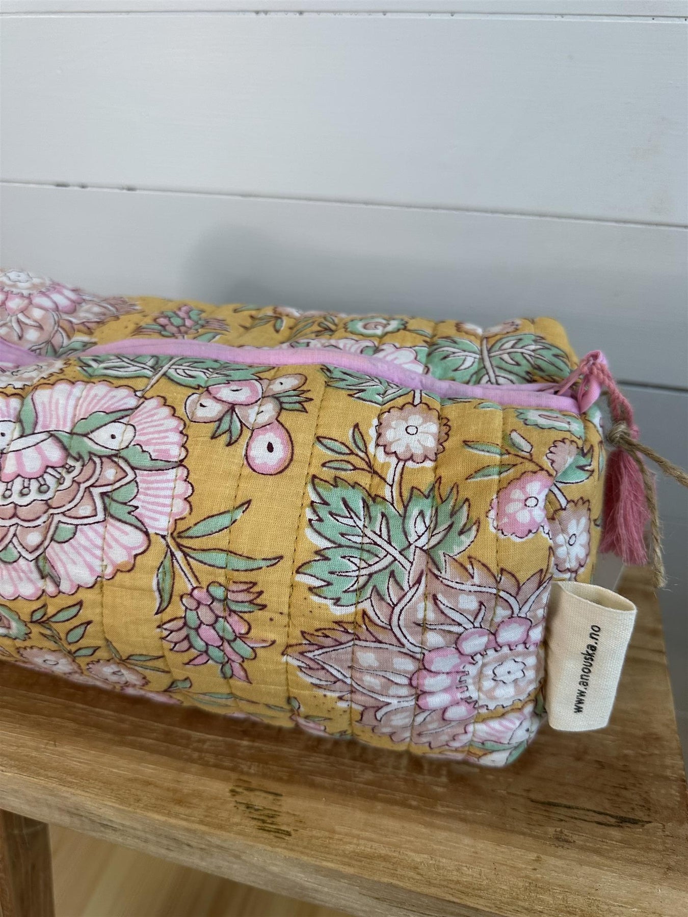 Toalettmappe med blokktrykket mønster - trykket for hånd. Foret med plast.