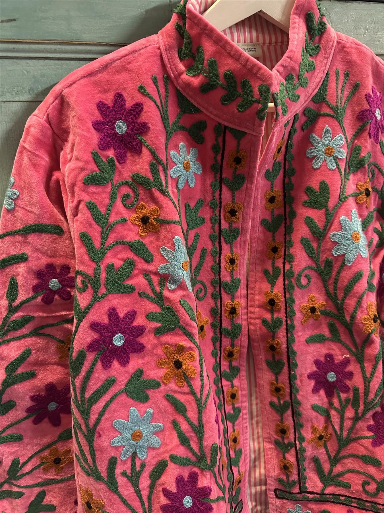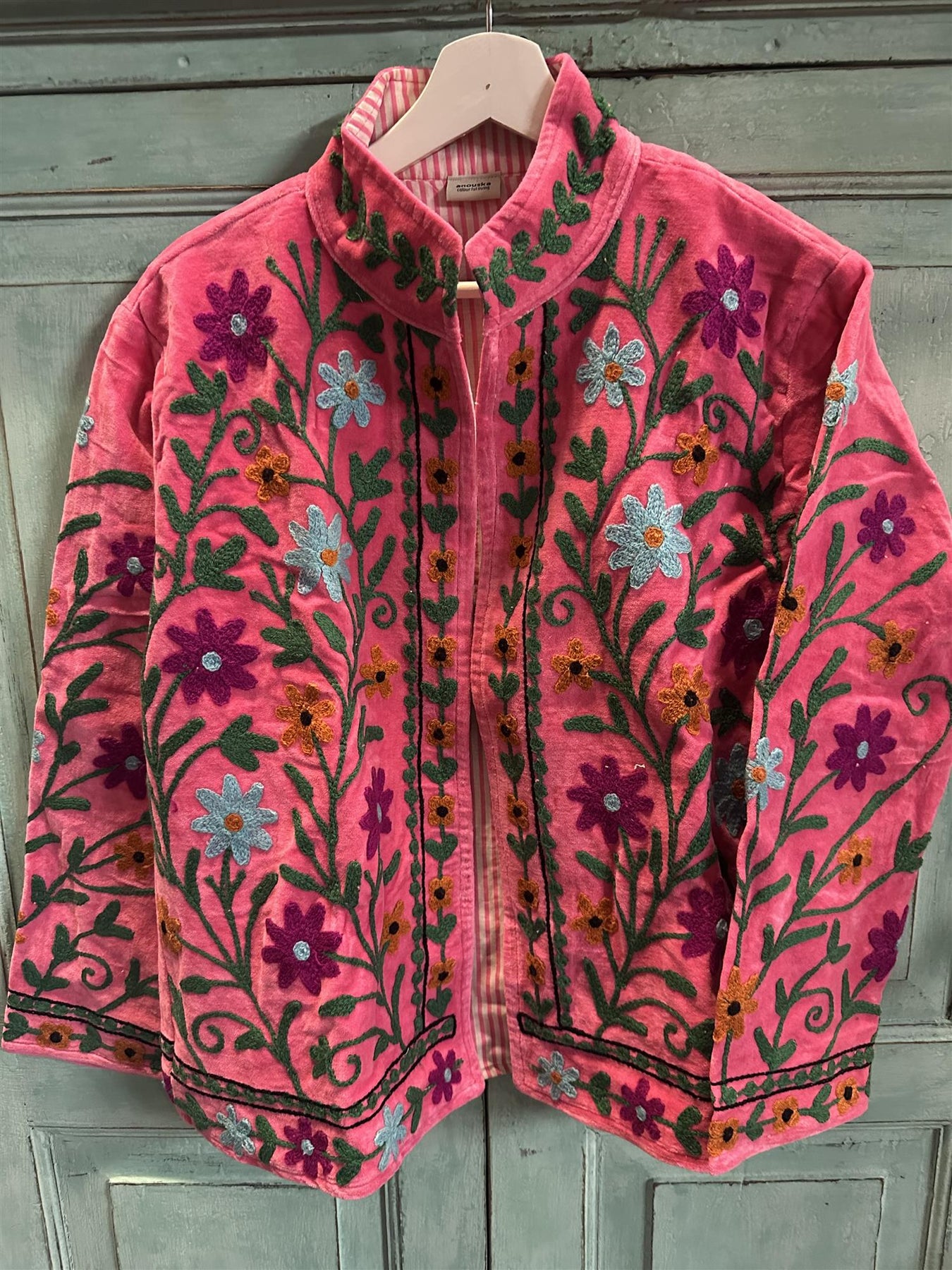 Unik velur jakke med vakre broderier. Ingen jakke er lik. Foret med stripet bomullsstoff