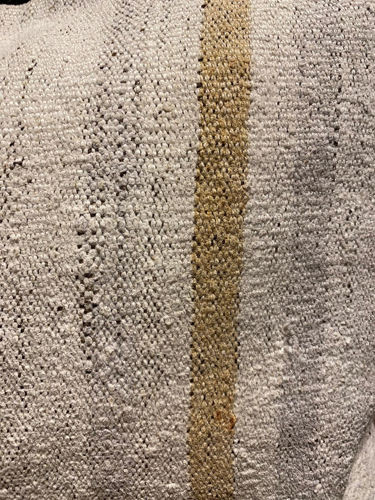 Materiale: håndhevet 100% ull. Baksiden er i 100% bomull med glidelås lukning.