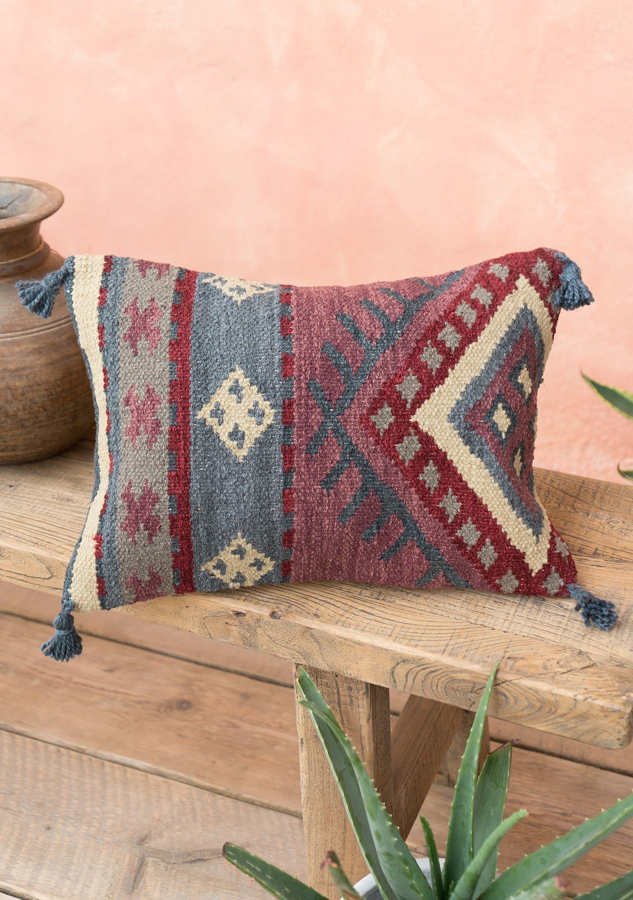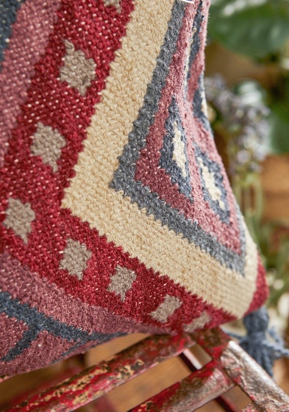 Vakker kelimpute med dusker i alle 4 hjørner, mix med andre ensfargede putetrekk på hytta eller hjemme å få et varm og hyggelig interiør.