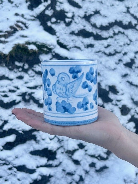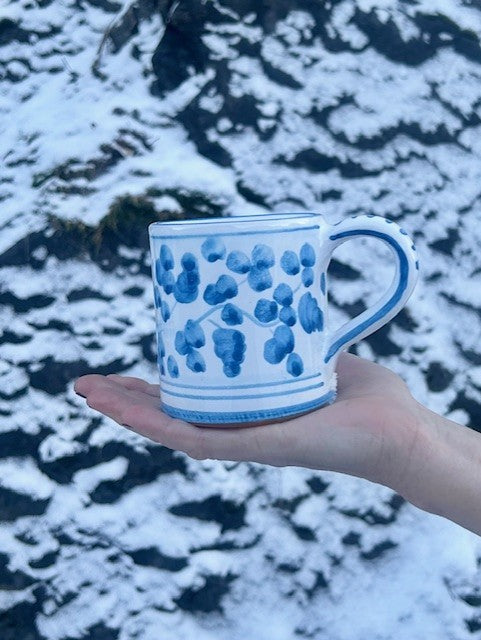 Håndlaget og håndmalt krus produsert spesielt for Anouska i Deruta i Italia. Byen er er kjent for sin frodige, fargerike og tradisjonsrike keramikkproduksjon.