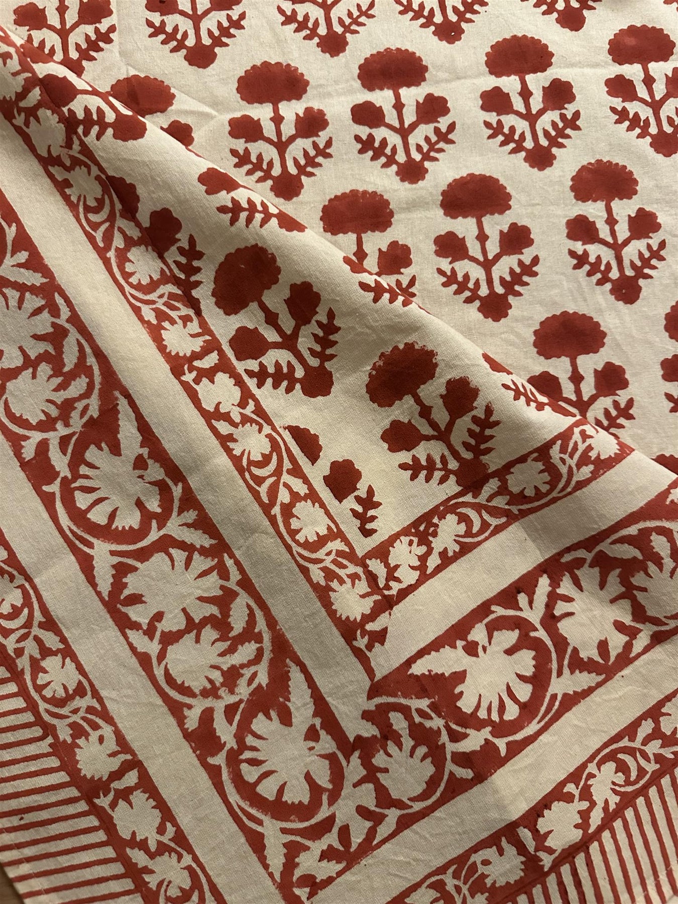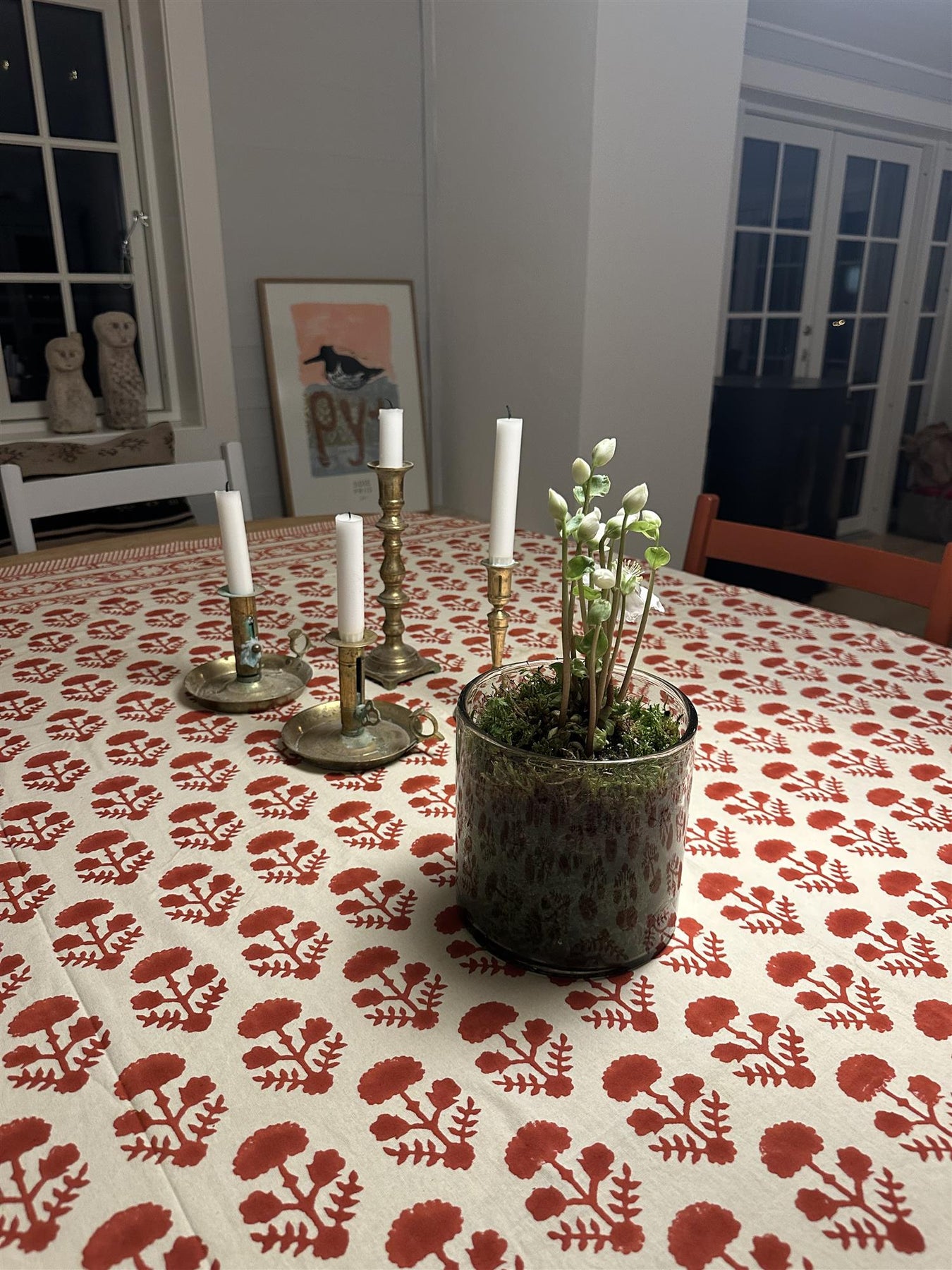 Duk i blokktrykket mønster som er trykket for hånd. Fin å kombinere med linservietter eller ensfargete papirservietter.