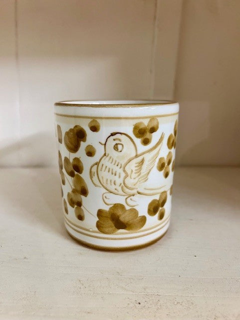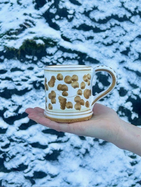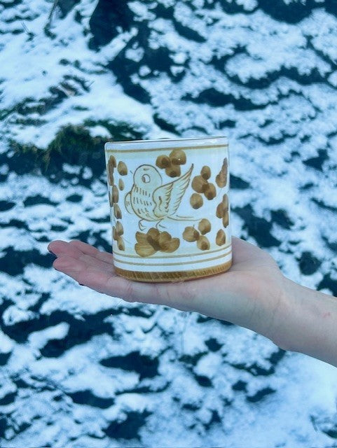 Håndlaget og håndmalt krus produsert spesielt for Anouska i Deruta i Italia. Byen er er kjent for sin frodige, fargerike og tradisjonsrike keramikkproduksjon.