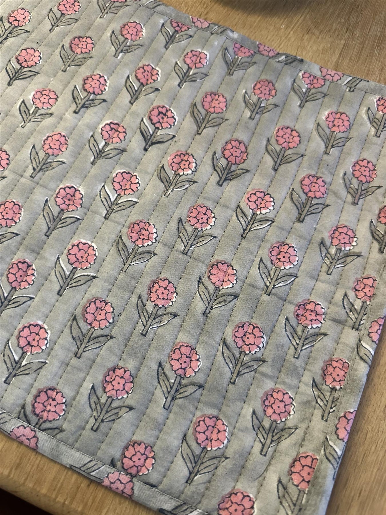 Vendbar vattert spisebrikke med blokktrykket mønster som er trykket for hånd. Samme mønster på begge sider. Fine å kombinere med linservietter eller ensfargete papirservietter.