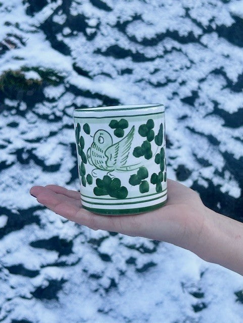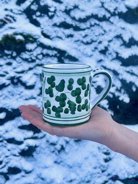 Håndlaget og håndmalt krus produsert spesielt for Anouska i Deruta i Italia. Byen er er kjent for sin frodige, fargerike og tradisjonsrike keramikkproduksjon.