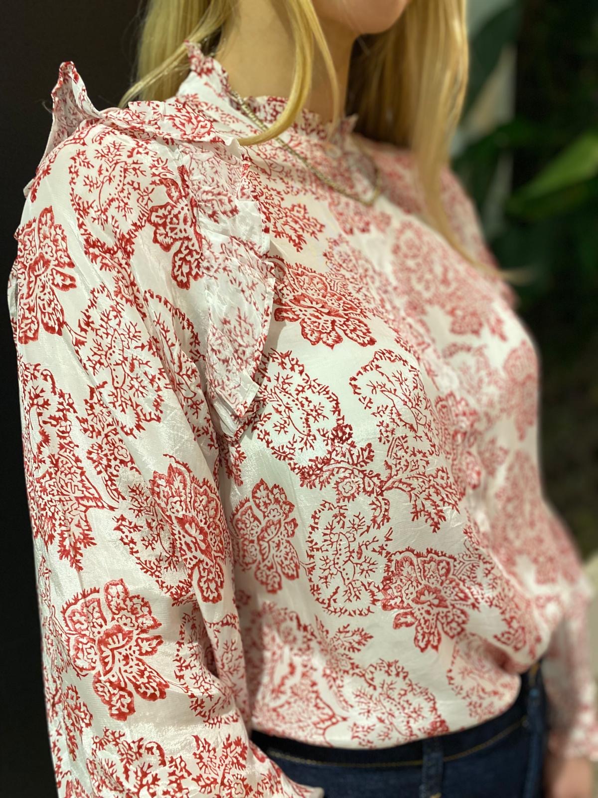 Nydelig feminin bluse med smalere passform. Fin detalj med rysjer på kragen, på skulderen og nederst på ermet. Skjult knepping hele veien ned foran.