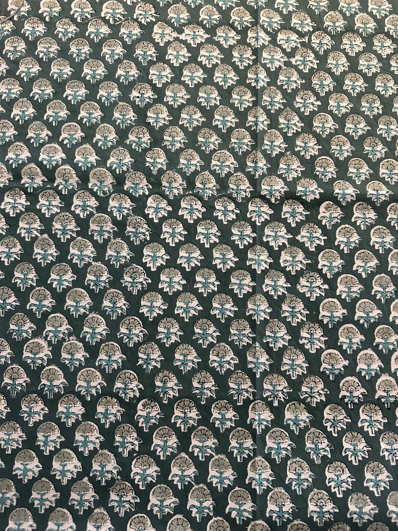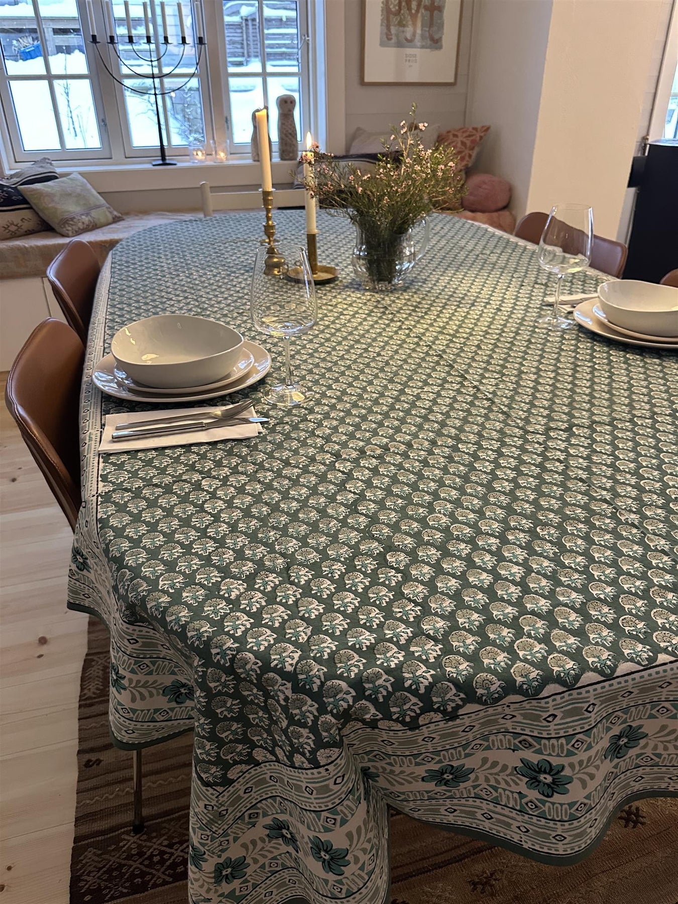 Duk i blokktrykket mønster som er trykket for hånd. Fin å kombinere med linservietter eller ensfargete papirservietter.