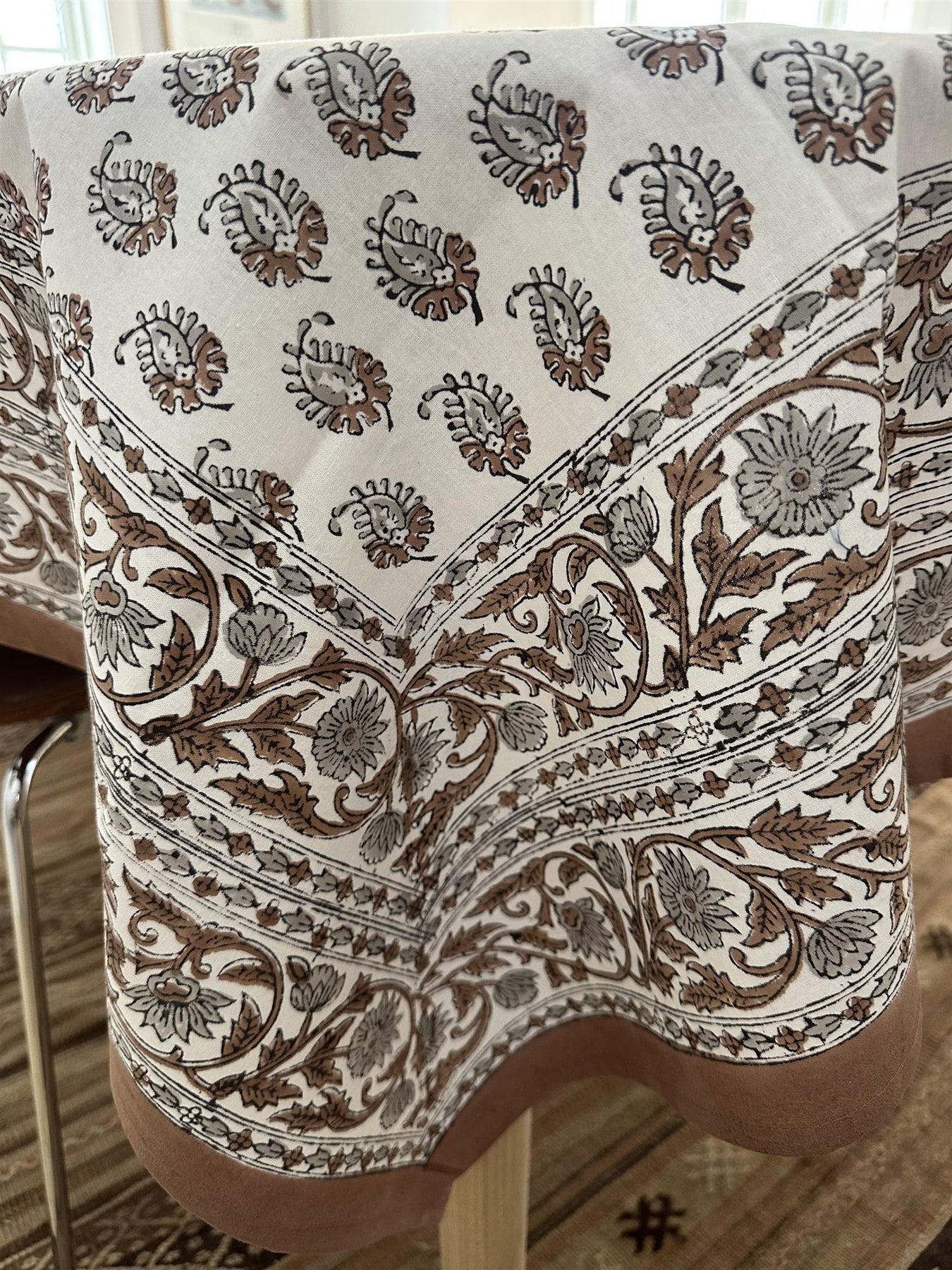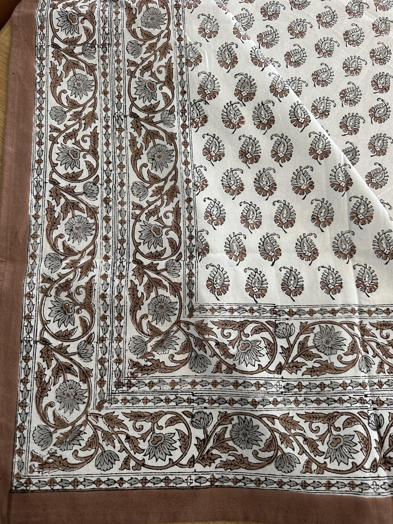 Duk i blokktrykket mønster som er trykket for hånd. Fin å kombinere med linservietter eller ensfargete papirservietter.