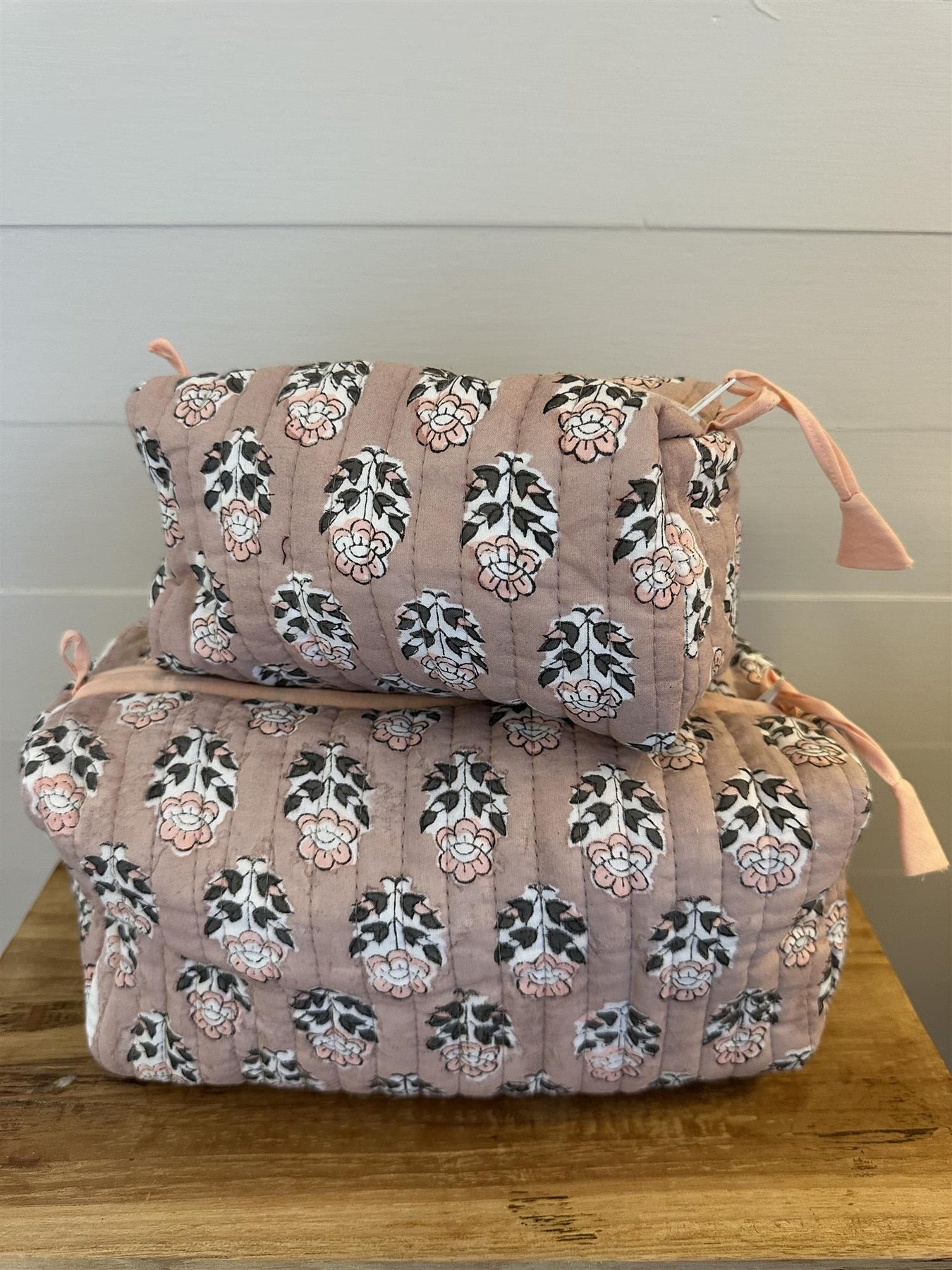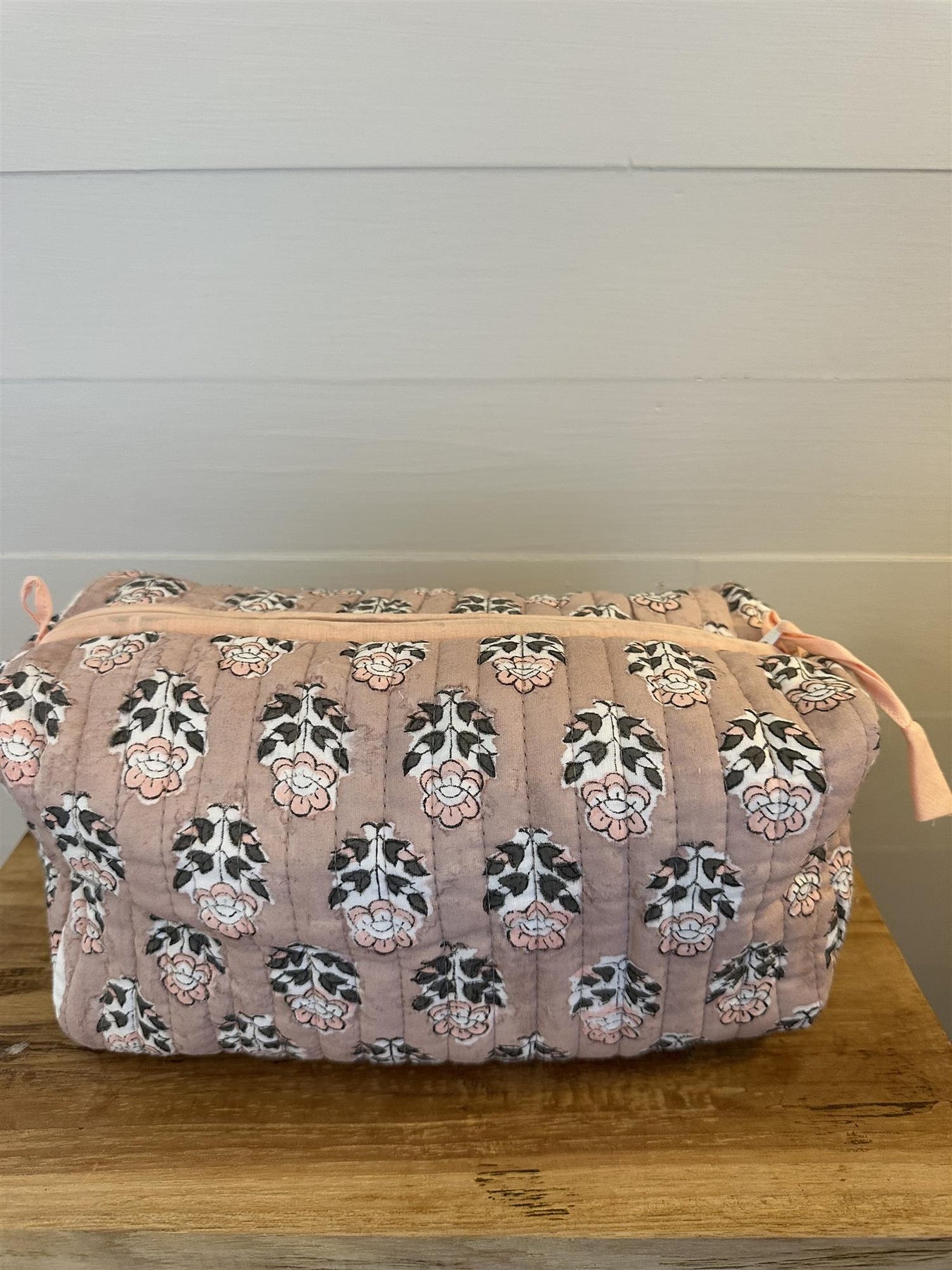 Toalettmappe med blokktrykket mønster - trykket for hånd. Foret med plast.