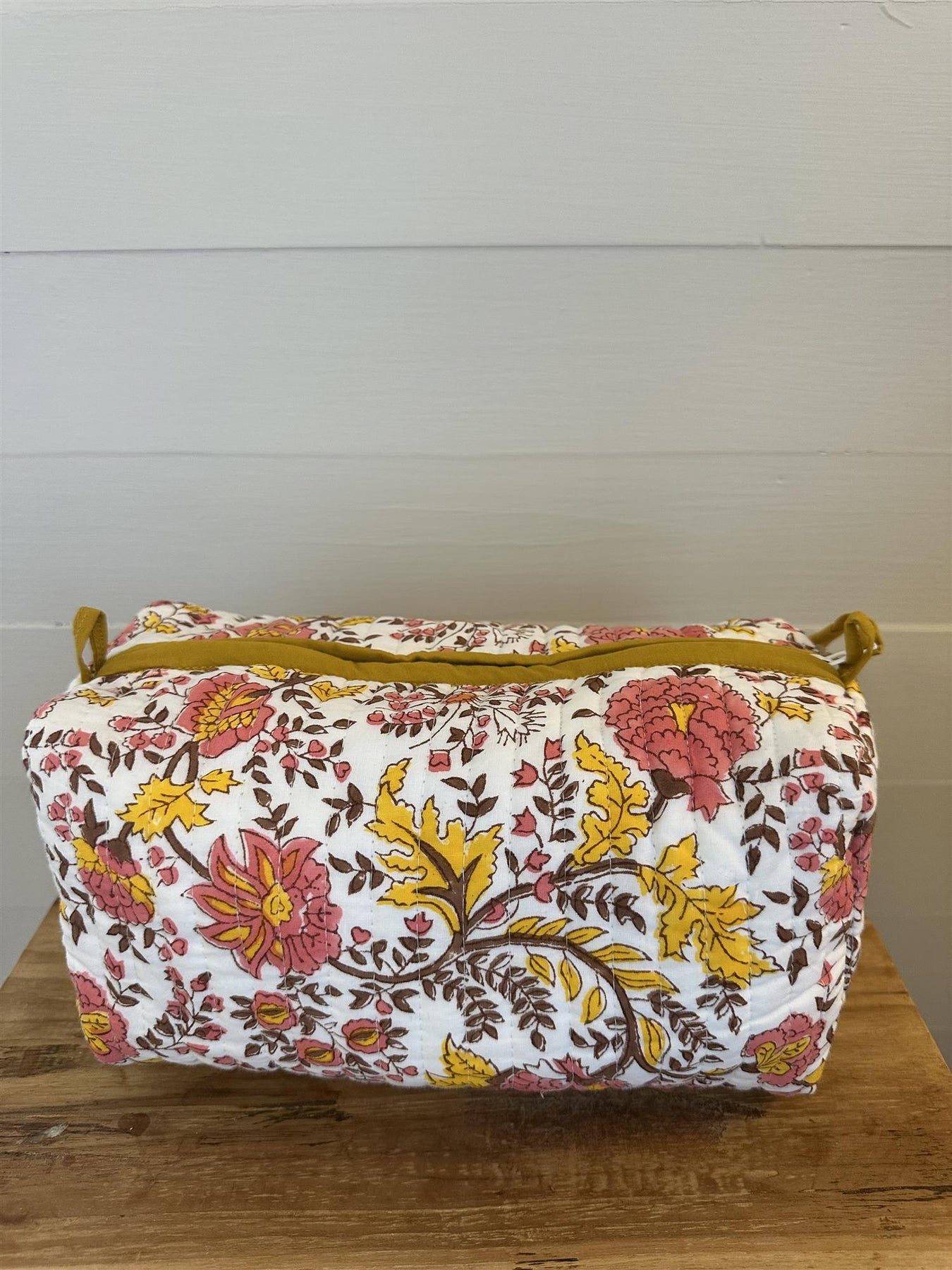 Toalettmappe med blokktrykket mønster - trykket for hånd. Foret med plast.