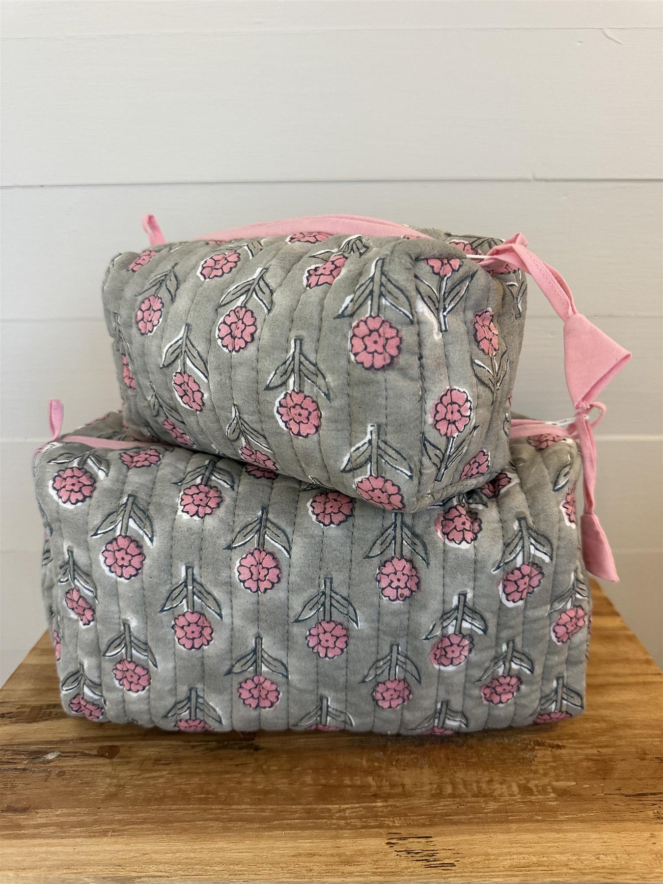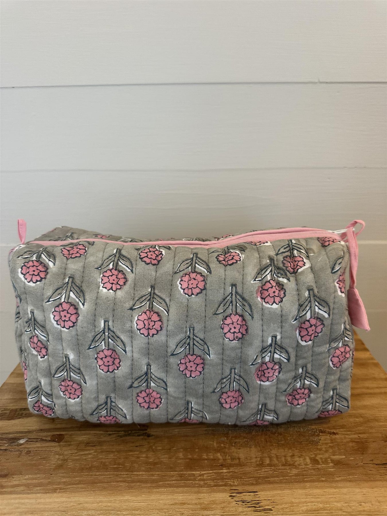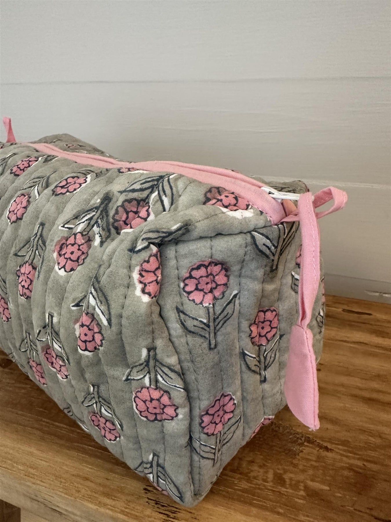 Toalettmappe med blokktrykket mønster - trykket for hånd. Foret med plast.