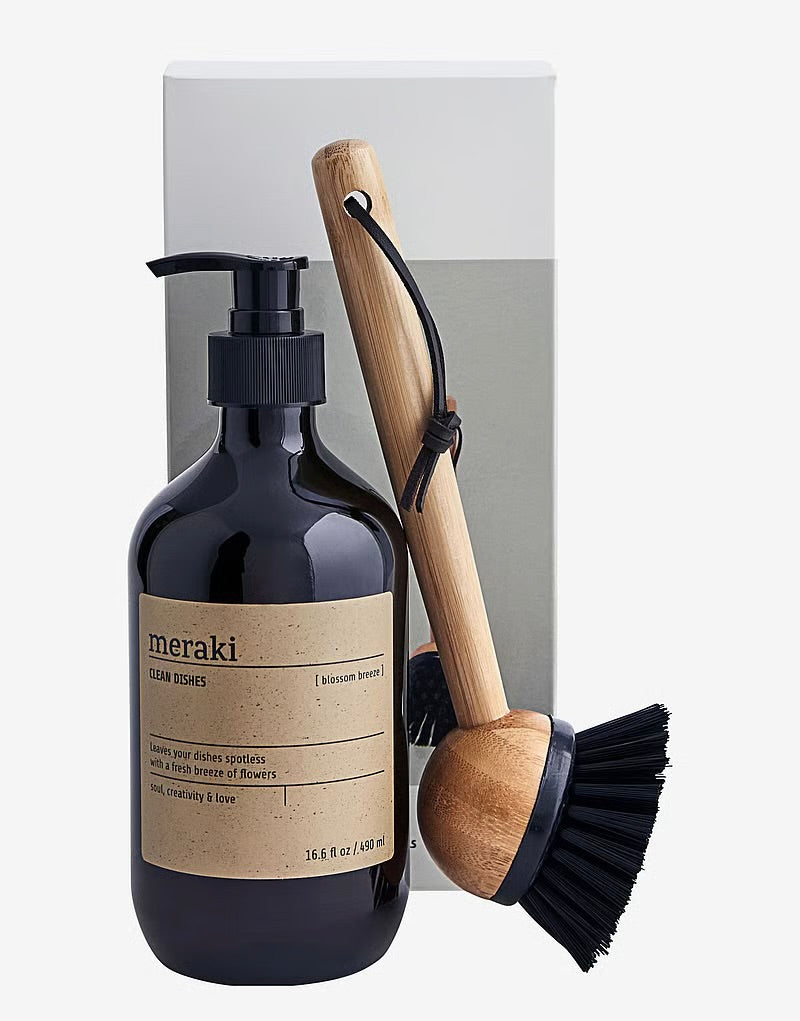 Gaveeske med oppvasksåpe og oppvaskkost. Oppvaskkosten er laget av bambus og hodet kan byttes ut. Oppvasksåpen dufter fantastisk.
